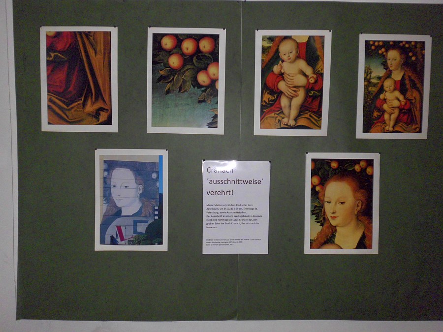 Im ehemaligen Treffpunkt Soziale Stadt, dort tagte früher häufig der Arbeitkreis Bürgerstiftung als es die „Soziale Stadt“ noch gab, fand am 1. und 2. Dezember das Stiftertreffen statt. Dessen Programm war geprägt vom Textil-Verkauf des AK-Teams und einer Auswahlausstellung aus dem Kronacher Cranach-Archiv. Dabei wurde insbesondere auf Geschichte/n um Cranach-Bilder eingegangen und einzelne Ausschnitte aus Cranach-Werken exemplarisch vorgestellt, (Selbst-)Bildnisse von Cranach in Abfolge des Lebensalters aufgezeigt. Dazu gab es wieder einen Einblick in ein „Cranach-Zimmer“ eigener Art, in dem es unterschiedlichste Objekte zu bestaunen gab, vom Cranach-Porzellan bis zum Cranach-Fernseher. Neu wurde ins Archiv aufgenommen eine Spende vom Kronach-Creativ-Vorsitzenden Rainer Kober, nämlich eine Musterplakette vom „Cranach Unternehmer-Preis 2012″.