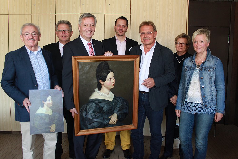 Bei der Rückgabe des restaurierten Bildes v.l. 1000-Jahre-Kronach-Vorsitzender Manfred Raum, Georg Löffler und Direktor Klaus-Jürgen Scherr, Sparkasse Kulmbach-Kronach, Alexander Süß, Bürgermeister Wolfgang Beiergrößlein, Vorstandsmitglied 1000 Jahre Kronach Lore Walker und Restauratorin Petra Zenkel-Schirmer.
