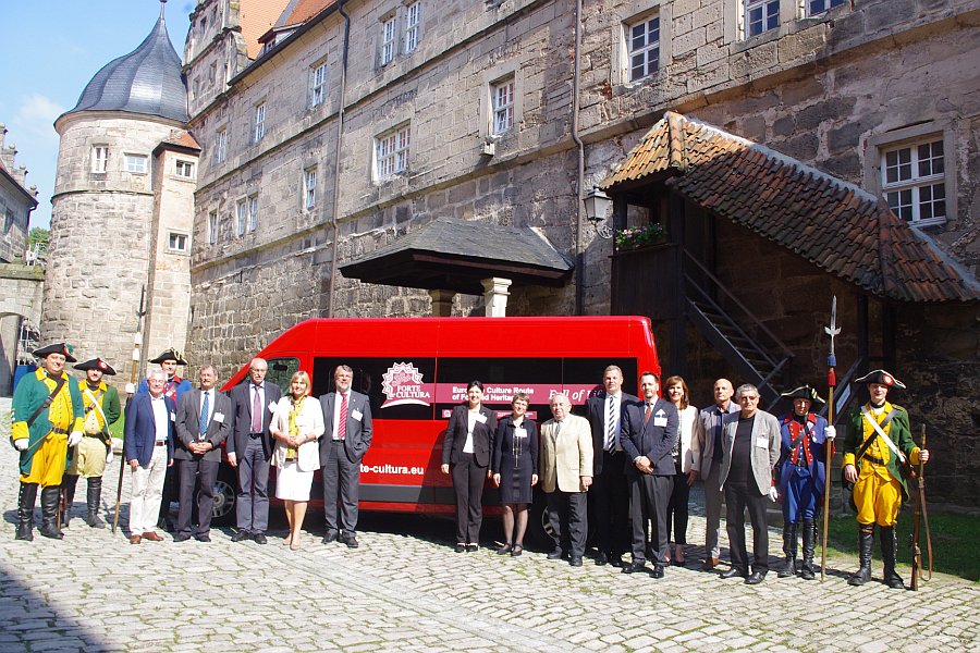 Eine Abordnung der Fürstbischöflichen Bambergischen Schützen und Artillerie-Kompagnie zu Kronach sowie 2. Bürgermeisterin Hofmann hatten die Gäste auf der Festung willkommen geheißen. Laut Hofmann sei die Festung Rosenberg in der jüngeren Vergangenheit noch attraktiver gestaltet worden. So sei die Fränkische Galerie nach aufwändigen Renovierungsarbeiten neu eröffnet und mit neuen Exponaten bestückt worden. Die Festungsherberge wurde generalsaniert, auf einen modernen Standard gebracht und vergrößert. Events wie Crana Historica, die Rosenmesse und die Faust-Festspiele lockten alljährlich viele Besucher an. Ihr besonderer Dank galt Hartmut Röder von Eccofort Berlin, der die gemeinsame kulturtouristische Werbemaßnahme ins Leben gerufen hatte. „Die Reiserouten verbinden Festungsanlagen mit ganz unterschiedlichen Charakter“, so Hofmann, die sich sicher zeigte, dass von der Kooperation alle Beteiligten profitierten.
