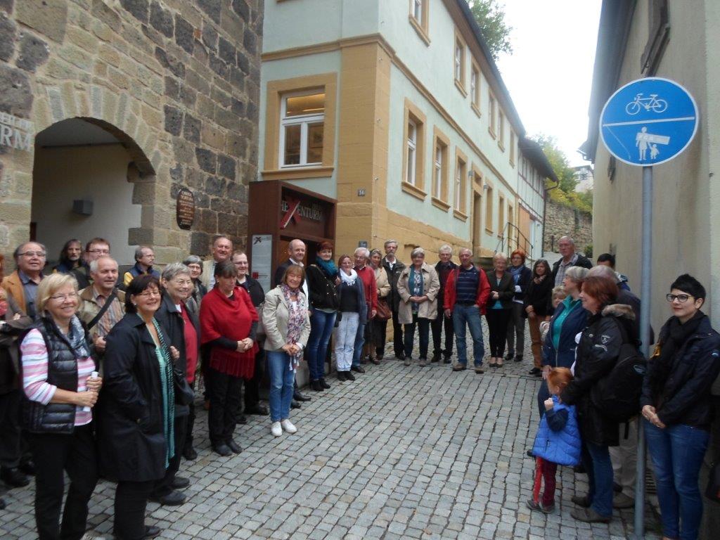 Die Leiterin des Dokumentationszentrums sieht daher in der Aufarbeitung der jeweiligen lokalen Geschichte zur Hexenverfolgung die Chance auch die aktuellen Probleme sichtbar und durchschaubar zu machen. Hans Götz, 2. Vorsitzender des Vereins, sah im Zeiler Dokumentationszentrum eine vorbildhafte Einrichtung für die Bemühungen der Stadt Kronach, den Hexenturm in der Oberen Stadt in diese Richtung inhaltlich mit lokalem Bezug zu gestalten. Die zweite Station das Knauf Museum Iphofen mit seiner aktuellen Sonderausstellung „Hexenwahn in Franken“ bezieht sich, wie es dem Titel der Ausstellung zu entnehmen ist, auf die Darstellung der Hexenverfolgung in Ober-, Mittel- und Unterfranken. Hier werden die Ursachen und die Protagonisten der Hexenjagd in Franken dem Besucher audiovisuell nahegebracht. Sie erfahren, dass die Fürstbischöfe der damaligen Hochstifte zum größten Teil auch „Hexenbischöfe“ waren. Die akribische Dokumentation von Einzelfällen, nachvollzogen aus Prozessakten, lässt einem die Untaten der damaligen Zeit regelrecht körperlich erleben. Die gezeigten Marterwerkzeuge unterstützen dies noch. Aber auch die künstlerische Aufarbeitung des hexerischen Zeitgeistes und der Hexenvorstellung findet man in der Ausstellung im berühmten Kupferstich „Die Hexe“ von Albrecht Dürer. Als Gegenwartskünstler zeigt der Kronacher Bildhauer Heinrich Schreiber mit einem Abguss seines Hexen-Epitaphs aus der Stadtgeschichtspromenade auf dem Landesgartenschaugelände die heutige Wahrnehmung in beeindruckender Weise. Eine Sonderausstellung hat naturgemäß nur temporären Charakter und bringt für einen gewissen Zeitraum, die ansonsten in verschiedenen Archiven und Museen gelagerten Dokumente und Artefakte an einem Ort zusammen. Die Art der Präsentation, insbesondere im audiovisuellen Bereich kann aber , nach Meinung von Vereinsvorsitzenden Manfred Raum, dem interessierten Besucher wertvolle Anregungen für lokale Projekte liefern. Die Teilnehmer der Informationsfahrt des Vereins „1000-jahre-Kronach-eV.“ konnten ausführliche Informationen und eine Vielzahl neuer Erkenntnisse zur Hexenthematik mit nach Hause nehmen. Für die teilnehmenden Kronacher Stadtführerinnen und Stadtführern war es eine nachhaltige Fortbildungsmaßnahme, die vom Verein zudem noch gesponsert wurde.