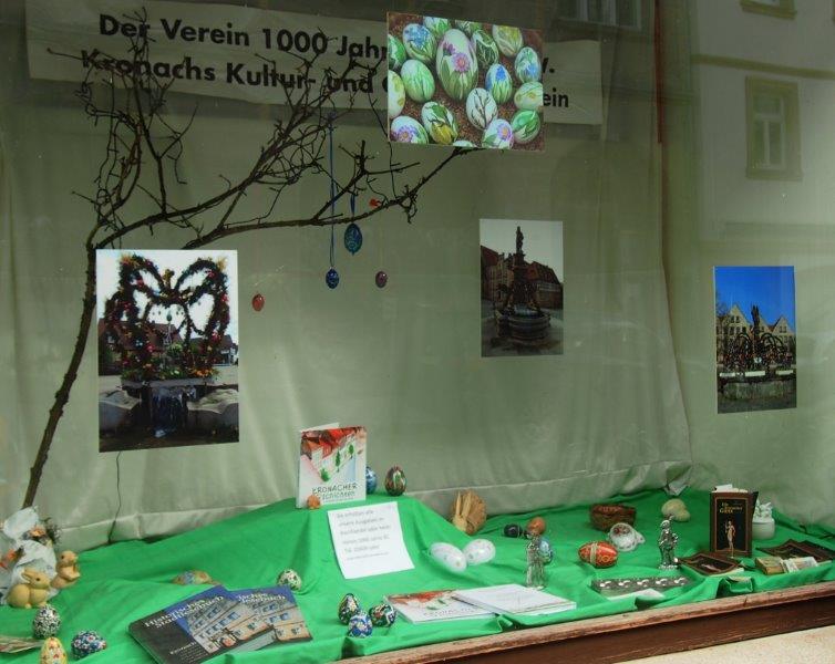 Wer in der Oberen Stadt vorbeikommt, wird in der Amtsgerichtsstrasse im Schaufenster des ehem. Schuhhauses Hümmer einen besonderen Ostergruß an alle Besucher finden. Mit den dort gezeigten Osterbrunnen aus Kronach (es sind leider aus Platzgründen nicht alle, die es hier gibt) soll auch der Dank an die ehrenamtlichen Helferinnen und Helfer ausgedrückt werden, die diese kleinen Sehenswürdigkeiten alljährlich erstellen.