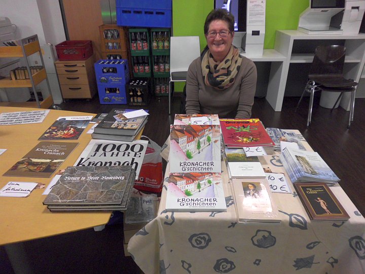 Auch der Verein 1000 Jahre Kronach e. V. war mit einem Teil seiner Publikationen beim Tag der offenen Kreisbücherei vertreten. Vom Historischen Stadtlesebuch bis hin zum Kinderbuch Kronicher G´schichten konnten sich die Besucher die verschiedensten Bücher, Zeitschriften und Kataloge, die der Verein herausgegeben hat, ansehen und erwerben. Unser Foto zeigt die Schriftführerin des Vereins, Angelika Martin, aus dem Team der Standbetreuung, am Büchertisch.