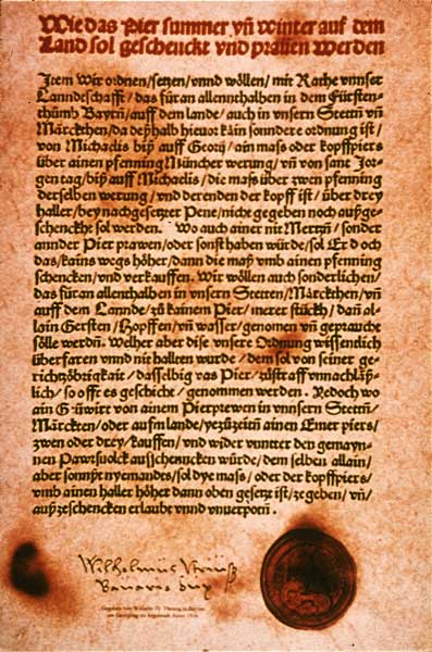 24. April 1516 verkündete Herzog Wilhelm der IV von Bayern das Reinheitsgebot für das Bier. Das war aber zunächst eine rein bayerische Angelegenheit. In anderen Regionen Deutschlands gab es je nach Stadt oder Herrschaft ebenfalls Vorschriften, wie gutes Bier zu brauen sei. So war es auch im Fürstbistum Bamberg, das ja erst 1803 im Rahmen der Neuorganisation Europas durch Napoleon, Bayern angegliedert wurde. Erst ab 1906 galt dann das bayerische Reinheitsgebot im gesamten Reichsgebiet.