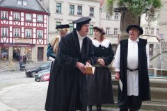 Das Eheverbot der Priester war nur eine Regel der katholischen Kirche, an denen sich Luther gestört hat: Die Allmacht des Papstes mit seiner uneingeschränkten Vorherrschaft, die Finanzierung von Kriegen, das Blühen des Ablasshandels. Gerade diese Praxis, dass man sich mit von der Kirche offiziell zum Kauf angebotenen Ablassbriefen sein Seelenheil erkaufen konnte, war seiner Überzeugung völlig zuwider. Um seine Bedenken der Kirche mitzuteilen, verfasste er 1517 die 95 Thesen, die sich – mit der neu entstandenen christlichen Bewegung, Protestantismus genannt – schnell verbreitete. 1530 hielt sich der Augustinermönch im benachbarten Coburg auf. Von dort korrespondiert er mit Philipp Melanchthon, der in seinem Namen die Anerkennung des Protestantismus auf dem Reichstag zu Augsburg verhandelt. „Wissenschaftlich nachweisbar ist ein Besuch Luthers in Kronach nicht. Aber wenn er in Coburg weilte, wäre es durchaus denkbar, dass er sich von seinem guten Freud Lucas Cranach dessen Heimatstadt zeigen lässt“, meinte Silke Wolf-Mertensmeyer, die am Reformationstag mit Mitgliedern der Pottu-Gruppe einen solchen Besuch – nach einer Vorlage von Hans Götz – als Erlebnisführung nachstellte. Hatten bereits am Vormittag an die 40 Personen die Spielszenen an verschiedenen Orten in der Oberen Stadt verfolgt, waren es am Nachmittag noch einmal rund doppelt so viele.