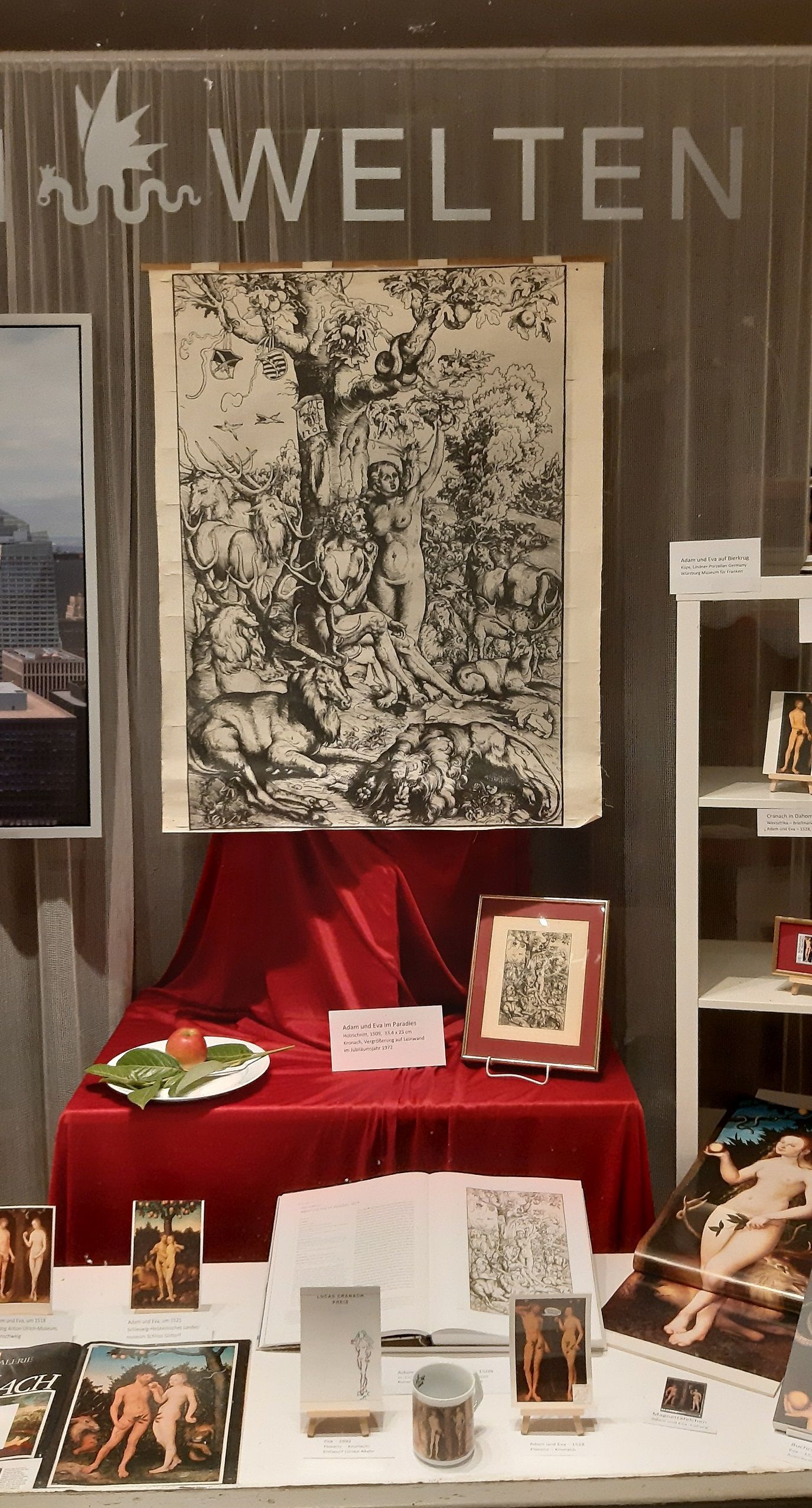 Bei seinen Adam und Eva-Gemälden hat er diesen Einfall aber nicht wieder aufgegriffen, sondern die beiden in unterschiedlichen Körperhaltungen neben einander gemalt. Mehr als dreißig Bilder sind bekannt und heute in Museen über viele Länder verstreut. Eines davon wird links im Fenster von der jungen Dame vorgestellt: das Bild ist eigentlich in London zuhause, wurde aber erst vor kurzem im Metropolitan Museum of Art in New York ausgestellt. Und von dort stammen das Halstuch und die Einkaufstasche mit dem Adam und Eva-Motiv und andere Artikel. So begegnet einem Cranach auch außerhalb von Museen. Übrigens beschäftigte sich die Ausstellung in New York mit dem Dialog von Mode und religiösen Kunstwerken.
